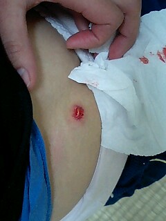 この日の定例練習中に、旋子でうつぶせに転倒。骨盤の前面でっぱりの骨の部分を思いっきり強打してしまいました。ひじや手首なども打ったのですが、そこには(強打したら通常出るはずの)外傷が出なかったので、骨盤のでっぱりの部分も「すんごく痛いな~」と思いつつ放置したまま帰宅。帰宅後トイレに入り、用を足そうとしてビックリ!血が出てる!そうです、骨盤前面のでっぱった骨の部分です。てっきりアザでもできて痛いのかと思っていましたが.........。出血していて、下着はおろかブレーカーパンツの裏地メッシュにまで血が染みてます。さらに、傷口の直径は約1センチ程度と小さいものの、傷の深さの方がちょっと大きく、傷口から何か白いものが見えます......。あ。皮膚の下の肉が見えてるよ..........(苦笑)(;^ω^)そりゃー痛いはずだわー(笑)。まぁすべての人におけるすべての怪我や病気は、自分の行動・言動・思考のおこないの蓄積を浄化するものですから、自業自得なんですけどねー。それにしても痛いですー。自分の皮下脂肪?真皮?を肉眼でまともに見たのは生まれて初めてですしー(苦笑)。(;^ω^)(;^ω^)(;^ω^)