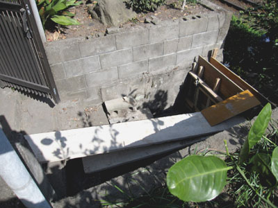 庭の工事。画像は昨日のものです。階段を降りたところに生コンで壁を作ってます。時期がよかったのか、一日で乾いてました。今日はもう階段の側面のブロックも取り除いて、土がかなり入ってます。作業は早いです~。さすがプロフェッショナル。