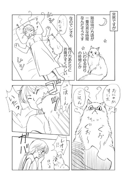 まだ暑い頃に描きはじめたマンガ。 もう涼しくなって、レオの明け方の行動もちょっと変化が出てきたんですが。 (最近はゴハン一辺倒です。朝までに4回ほど起こされてゴハンを催促されます) でも一応仕上げてみました。 マンガはデスクトップパソコンで仕上げて、 その後、ノートパソコンにコピーしてアップするんだけど。 ノートパソコンで見ると凄く画像の色が薄くて、絵や文字が見難い。 でも元々シャーペンで描いただけだから、薄いのは仕方ないんですよね。 筆圧弱いし。 見難かったらすみません。 マンガはいまひとつ要領を得ないですね...。上手くまとめるのって難しい...。 ※ フードは相変わらず一個一個手で食べさせてます...。 だって残したものはなかなか食べないんだもの(高いフードなのに) 暑い時期は置き餌をしとくと蟻がたかるしね。