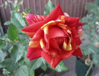 今年も2日くらい前からバラが咲き始めました。ウドンコ祭も開催されてますが(苦笑)今年一番のりはヴィヴァーチェの小さい方の株でした。気がつけばパッカーンと全開(笑)連日天気がよかったせいかド派手な色ですね。2番目はパレスシリーズ(たぶんファッション)これは上のヴィヴァーチェと同じ、2日前に撮った画像。このくらいの開き具合が好きです。今日はもうこんなカンジ。上の部分は陽が当たってるので明るく写ってます。植え替えのとき、どうも根にネコブセンチュウらしきコブがあったので処分しようとしばらく放置してたんですけど…。好きなバラなので、諦めきれず薬剤ネマトリンを土に混ぜて植え替えました。放置してたので根が黒く干からびてたんですけど、枯れもせず開花しました~。バラって強い。実は処分しようとしてたとき、2本挿し木をしたんです。それも根付いてしまって…増加してしまった~。挿し木、うちは冬場の水挿しだとまず失敗しないですね。(雑菌が少ない時期だから?)本日のカフェラテ。全開までもうちょっと。蕾がついてるのはコレ一個…。後の枝は…先端が丸くなってます。なんで?本日のスカーレットオベーション、小さい方の株。ウドンコなしのスカーレットオベーションなんて初めてです。感激。大きい方の株はウドンコだらけなんですけどね~。置き場で違うのかしら。ウドンコなしであまりに嬉しいのでアップでもういっちょ(笑)