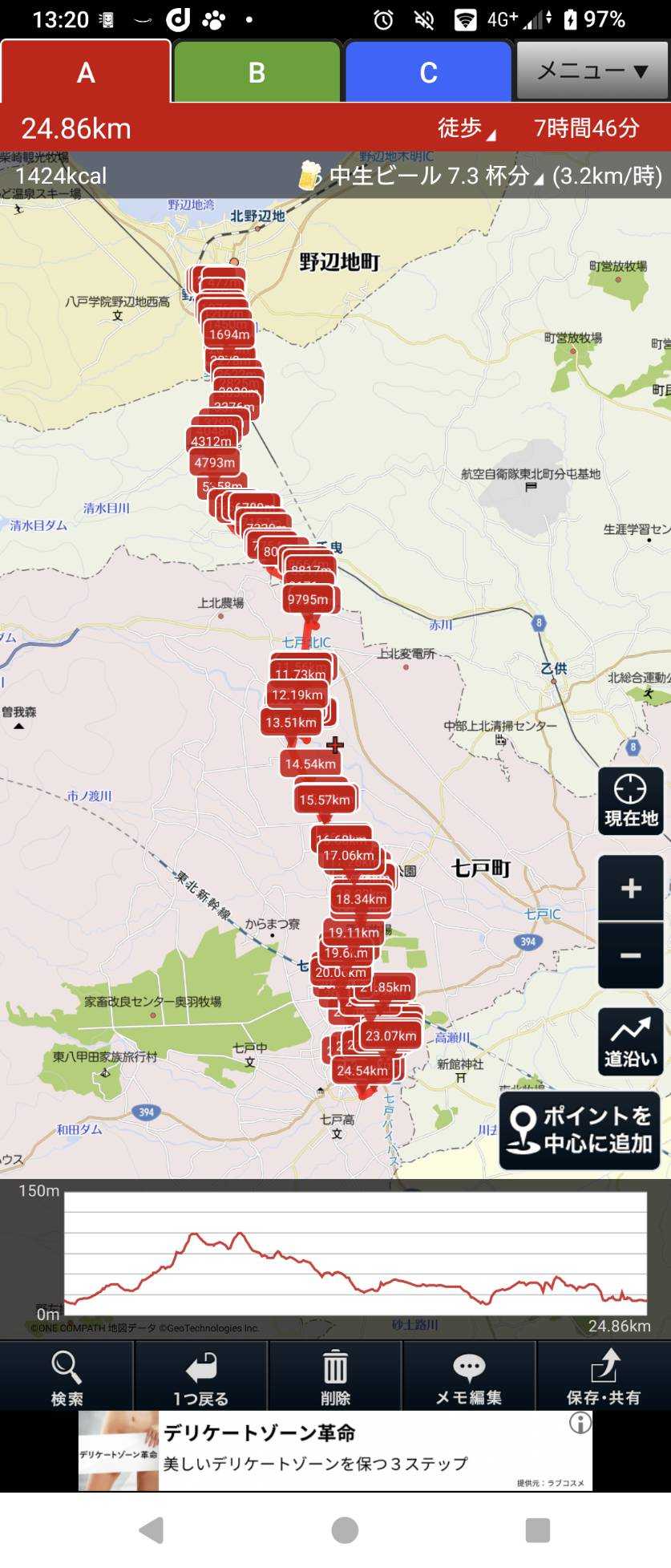 営業キロは20.9kmですが、「距離測」で計測したところ約25キロ歩く想定となりました。