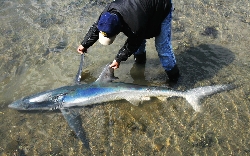 川にサメの死がい 河口から150メートル 本来、沖合に生息しているはずのヨシキリザメ(メジロザメ科)が、田辺市新庄町の新川河口から150メートル付近で死んでいるのを地元住民が見つけた。研究者は「餌を追いかけて迷い込み、浅瀬に乗り上げて引き返せなくなったのだろう」とみている。 全長2・24メートル、重さ32・5キロ、胸びれは長く45センチもある。サメが死んでいた付近に実家があるという浜名允雄さん(59)=同市神島台=によると、7日に地元の人が見つけ、その時は肌もつやつやしていて目もきれいだったという。「これまでエイやスズキが川を上っているのを見たことはあったが、サメは初めて」と驚いていた。 魚類に詳しい元高校教諭の池田博美さん(61)=同市あけぼの=が持ち帰って調べたところ、5歳の雄であることが分かった。池田さんは「紀南地方に普通にいるサメだが、湾の奥まで入ってくるのは珍しい」と話した。ヨシキリザメ 最大全長は3・8メートル。世界の温帯から熱帯海域に分布する。マグロのはえ縄に掛かり、良質のフカヒレになる。人を襲う危険性があると言われている。【新川で死んでいたヨシキリザメ(8日、田辺市新庄町で)】('07/03/10)俺の感想もしこんなとこで・・・・たとえばおれらの近くだと八幡川にこんなんが死んでたら俺だったらどうするだろう?・・・・・・とりあえず死体を解剖させてもらうか・・・・