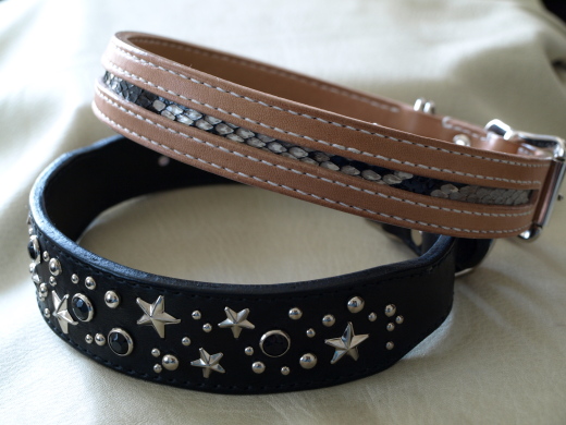 久々の首輪ネタです。星形のスダッズをランダムに打ったものと、ニシキ蛇の革をインレイに使用したものです。ゴールデンのオーナーさんからご注文をいただき、完成したので本日発送いたしました。トルコ在住でゴールデンを4頭も飼ってらっしゃるそうで、とてもうらやましいです。うちも余力があればもう1頭位増やしたいところですが、今のところは2頭でいっぱいいっぱいかなぁ。トルコってエーゲ海とか地中海とかあっちのほうですよね。あまりよくわからないのですが歴史的な世界遺産とか多いみたいですし、きっと奇麗ですばらしいところなんでしょうねぇ。一生のうちに一度は行ってみたいものです。自分が直接行くことはなかなかできませんが、自分の作ったものがそういった場所へ運ばれ使用されるというのはなんだか不思議な感じもあり、うれしく思います。それにしても同じレトリバーでも個体差によっておおきさってかなり違うものですよね。今回注文いただいたのは男の子の分らしいのですが、わりと大柄なのかな。うちのと同じサイズのものと比べるとこの通りかなり長さが違います↓↓↓うちのは2頭とも30キロ弱でまあ標準的な体型だと思うのですが、小柄な女の子と大きめな男の子ではかなり違うんでしょうねぇ。