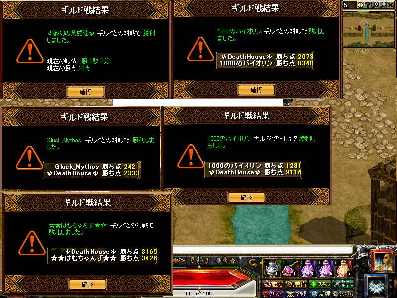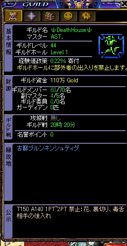 秘密ダンジョンのゲートが開いていても すぐクリックして入れないですよね? 「秘密ダンジョンが消えています・・・」 的なメッセージが出ます。 それは何故だろう?というあるPTMの問いかけにあるBISさんが答えてくれました 何故か感動してしまいましたよwwwww 年末にですね こんな看板名で露店出してたところ耳下さった方が数名いました。 ・・・ 関係ない事ばかりじゃないか!「疑」って答えてくださった人以外意味不明ww 一名感想ですしw ブッシュさんもうすぐ終わりですね。 騒動にもなったあの靴 7億くらいでしたっけ RSでいうとどんなOPが付いてるのでしょうかね 2009年新年明けましてオバマさん^^^^ 年末~年始のGV戦績です まったりと愉快な仲間達 様X時の破壊神X 様 ※ローマ数字が正しいですが、エラーが出るため似たような記号で代用させてます、悪しからず。†ebony_forest† 様ξ Corrupted Fools ξ 様 対戦有難うございました^^ 年末年始正直此方の人数が1PT少と参加率が低めだったのですが火力職の皆様のタゲ合わせがとても素晴らしく人数的に劣勢な相手でもLvが↑の格上相手でも粘り勝ち出来た事は、とても嬉しくうちの誇りですね。少数精鋭ってこういうことかーと改めてうちの団結力は凄いなっと我ながら関心した年末年始でした。 今年もデスキャロット(☆空の恋人☆)を( `・ω・´)ノヨロシク御願いしますψDeathHouseψも( `・ω・´)ノヨロシク御願いします昨年お世話になったG様今年もよろしく御願いします^^