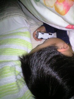 トミカ、もしくはぬいぐるみを布団に入れて一緒に寝てます。