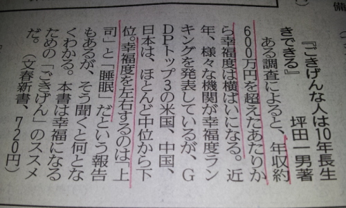 本日読売朝刊に、坪田一男氏の「ご機嫌な人は10年長生きできる」に対する書評に、「・・・年収600万円超えたあたりから、幸福度は横ばいになり・・・幸福度を左右するのは、上司と睡眠だ・・・」というのがありました・・・ まァしかし、民間の中小企業で、年収600万円までいくのが大変ですが・・・ 大半の人はサラリーマンですので、直属の上司が運命を左右するという事でしょう・・・ 部下は選べますが、上司は選べないところに、サラリーマンの悲哀が潜んでいそうです・・・ そういう意味で、私の20代の4年間のサラリーマン生活は、上司に恵まれて幸福でした・・・ 課内の先輩にはイロンナ人がいましたが、私が仕事しやすいように上司が配慮してくれました・・・ その代り、新規開拓、新商品開発、既存商品のアレンジ開発という「かなりキツイ」、他の課員が出来ないようなことを中心に仕事をさせられました(自ら希望しましたが)・・・ まァ、古い金物・建築建材業界にあって、何も知らない新人に「暴れまわってもらったら面白い!」と上司が考えたのでしょう・・・ 当時は「家業を継がず、この会社で、サラリーマンとして出世するのだ!」という意気込みで、とにかく4年間死に物狂いで頑張りました・・・ 上司がヨカッタから、100%頑張れたのだと思います・・・結局、頑張れずに一生を終える人が大半の世の中にあって、確かに幸せだったと思います・・・ 睡眠については、ついこの間まで、夢で仕事をするのが常でした・・・計算やアイデアを夢の中でする・・・ 一番酷かったトランクルーム立ち上げの頃は、他社の織物会社で1年半、1日12時間現場で働きながら、宅建の受験勉強をしていた頃は、夜の9時に寝て朝の2時に起床していましたが、計算上は5時間睡眠になりますが、慢性疲労と熟睡できなかった事を考えると、実質4時間も寝れていなかったと思います・・・ 仕事中、現場で居眠りしながら歩いていた事も度々で、何回もこけそうになりました・・・ お陰様で今は、「目覚まし時計無し」スタイルで、自然に起きます・・・ ジムがなければ、夜10時に寝て、だいたい朝4時起きですねェ・・・6時間の熟睡です・・・ しかし、まだまだ仕事の夢が多いのは「職業病」だと諦めていますが・・・(笑)※日本最安値!(年平均2回の利用で、近くにある必要はない) トランクルーム貝塚※貝塚市の不動産情報の総合サイト 貝塚不動産.comにほんブログ村 にほんブログ村にほんブログ村 大阪府 ブログランキングへ