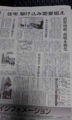 本日朝刊に「住宅 駆け込み需要狙え」という記事がありました・・・ 2014年4月の消費税の引き上げ前の、住宅だけでなく車とかの高額商品の「駆け込み需要」を狙うというものですが、私にはどうもマスコミが勝手に作った「ブーム」のように思います・・・ けっして、このマスコミのワナに嵌ってはいけません・・・ むしろ消費税「増税後」に買った方が、安く買えると思います・・・ 「増税前」は、確かに税金は少ないですが、需要(買う人)が増えますので、単価そのものが上がります・・・ このへんの「カラクリ」を見抜く必要が絶対あります・・・ 「増税後」は需要が急落しますので、単価そのものが増税分よりも下がる可能性が高くなります・・・ 好景気でインフレ基調なら別ですが、2,3年で「不況のデフレ」から脱却できるはずもない状況ですから、尚更「増税後」に買った方が安く買えると思います・・・ 正に「人の行く裏に道あり」ですかねェ・・・ しかし残念ながら、日本人の習性で「みんなで渡れば怖くない」式で、増税前にイロイロ買わされるのでしょうねェ・・・ けっしてマスコミや他人に惑わされず、自分が本当に欲しいモノを、欲しい時に買うのが一番だと思います・・・※日本最安値!(年平均2回の利用で、近くにある必要はない) トランクルーム貝塚※貝塚市の不動産情報の総合サイト 貝塚不動産.com※地域最安値!月額5250円岸和田市東ヶ丘町「月極駐車場」にほんブログ村 にほんブログ村にほんブログ村 大阪府 ブログランキングへ