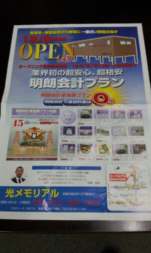 本日朝刊に、12月9日貝塚市麻生中に新しい葬儀式場「光メモリアル」がオープンというチラシが入っていました・・・ ちょうど中央線(40号線)高架横の、20年くらい前にカラオケ屋さんがあった建物です・・・ 所謂コンバージョン(建物の用途変更)という不動産活用ですねェ・・・ 森のシティホール(葬儀式場)も、元パチンコ屋からのコンバージョンですから、時代の流れに応じた不動産活用は、もはや必須ですねェ・・・ 時代の変化に対応できず、いつまでも同じ業態にしがみつくのは、「見込みのないヤクザな男にしがみついている女」みたいなもので、視点を変え、行動も変えないと生き残っていけません・・・ そういう意味で、この建物の葬儀式場へのコンバージョンは正解だったかもしれません・・・ 確かに10数年前は、町内での葬式は自宅でするのが一般的でした・・・もっと昔は、家で結婚式もしたようで、家もそのように(田の字)作られていました・・・ それが今では、町内の葬式の殆どが、「楽や!」とかの理由で、このような業者に任せています・・・まァ、大雑把に「ライフスタイルの変化」とでも言うのでしょうか・・・ しかし不動産のオファーでも最近この分野も増えたり、大手が参入していますが、競争が熾烈さを増し、既に貝塚市内に11業者がひしめき合っています・・・人口が貝塚市の2倍以上の岸和田市さえ、10業者しかありませんから、実際どうなんでしょう・・・※日本最安値!(年平均2回の利用で、近くにある必要はない) トランクルーム貝塚※貝塚市の不動産情報の総合サイト 貝塚不動産.com※地域最安値!月額5250円岸和田市東ヶ丘町「月極駐車場」にほんブログ村 にほんブログ村にほんブログ村 大阪府 ブログランキングへ