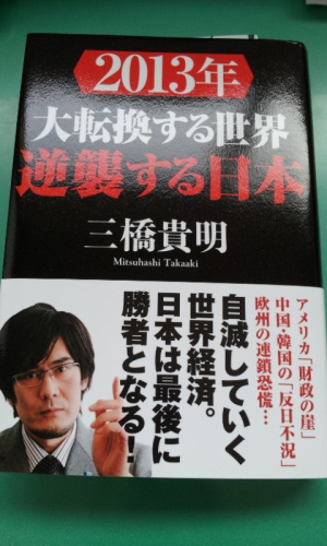 最近メディアにちょくちょく出てくる経済評論家の三橋貴明氏の近著「2013年大転換する世界 逆襲する日本」を読みました・・・ 帯には「アメリカの財政の崖、中国韓国の反日不況、欧州の連鎖不況・・・自滅していく世界経済。日本は最後に勝者となる。」とあります・・・ TPP問題をデータに基づき解りやすく説明しているところや、ギリシャや中国韓国の「反日」問題も歴史や金融理論に基づき、懇切丁寧に解説されているところがヨカッタです・・・ テレビや新聞に出てくる評論家の先生は、「スポンサー」の顔色をある程度窺いながら発信するものですが、三橋氏のそれはスポンサーに関係なく「明快」に持論を展開するところに好感が持てます・・・ この本を読んで、これまで少し迷っていましたが、来る総選挙で投票する立候補者や党が少し明確になりました・・・ まァ、自分の思うような道を生きていくには、イロンナ本を読んだり、イロンナ経験をして刺激を受け、マクロの「自分なりのビジョン」を持ち、日々のミクロの努力をするのが、幸せへの近道かいなァ・・・と思うのです・・・※日本最安値!(年平均2回の利用で、近くにある必要はない) トランクルーム貝塚※貝塚市の不動産情報の総合サイト 貝塚不動産.com※地域最安値!月額5250円岸和田市東ヶ丘町「月極駐車場」にほんブログ村 にほんブログ村にほんブログ村 大阪府 ブログランキングへ
