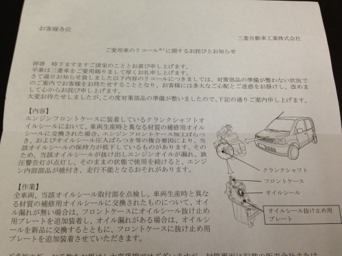 普段よく乗っています三菱自動車の軽トラック「ミニキャブ」が、部品のリコールです・・・ エンジンのオイルシール関連に不具合があるとの事です・・・ 早速点検してもらったところ、何の問題もありませんでしたが、部品を交換してもらいました・・・ 弊社の軽トラはすでに10年以上乗っていますが、よく走りますし何の問題もありません オートマのエアコン付で年中快適です・・・ 織物時代は、原料の糸や製品の織物、タテ糸を巻いた「ビーム」など、常に最大積載重量ギリギリで走っていました・・・ 荷物を載せるだけでなく、従業員の送迎やウインドサーフィンで道具を海まで運んだりもしました・・・ 狭い「村中」を走るにも、小回りの利く軽トラが大活躍です・・・ 不動産の物件を見に行くのにも、何処にでも停められますので、とても便利です・・・ トランクルームの客さんにも、レンタル(有料)で大活躍です(業界初!)・・・ 引越業者に依頼するほど荷物の量がない場合や(1トン未満の荷物)、費用を抑えるために自分達で運ぶ場合、乗用車しかない場合、車を所有していないお客さんにとって、正にこの軽トラは救世主です・・・ 軽トラも「転職」で活躍でき、喜んでいる事でしょう・・・ 近場は極力自転車に乗るようにしていますが、それ以外は殆ど私の足は軽トラです・・・ 乗用車には、あまり乗りませんねェ・・・ 弊社の「ブルー」の軽トラには「トランクルーム貝塚」と「貝塚不動産.com」とデカデカと書いていますので、メチャ目立ちます・・・ 軽トラの殆どは「白」で、いくら宣伝文句を書いても目立ちませんが、ブルーに白字は10倍目立ちますので、もう宣伝と「割り切って」乗っていますねェ・・・ 最初は恥ずかしかったですが、すぐに慣れました・・・人間、諦めが肝心・・・ 何事も諦めるところから、新しい何かが「始まる」と思うのです・・・ という事で、この軽トラも「乗り潰す」つもりで、「電気軽トラック」が出来るまで、あと数年は乗りたいですねェ・・・ここもポチッと押してください!ご協力お願いします!にほんブログ村 にほんブログ村にほんブログ村 大阪府 ブログランキングへ