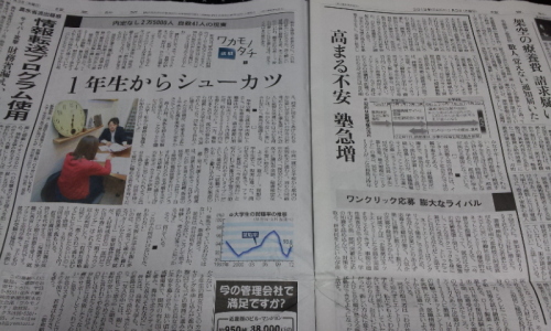 本日読売朝刊に「1年生からシューカツ」というショッキングな見出しが出ていました・・・ 副題には「内定なし2万5000人 自殺41人の現実」・・・ 年末に、大阪本町に宅建法定講習に行った時も、大学3年生がリクルート姿で、ビジネスの町をウロウロしている姿が非常に目立ちました・・・ 大学生の就職戦線が厳しいというのは知っていましたが、まさかこれ程とは思いませんでした・・・ 日本の事情を知らない外国人が見たら、この「奇妙な光景」に驚くでしょう・・・ 普通に考えれば、大学3年というのは勉強、サークル活動、バイト、恋愛の4つに「脂が乗って」、まさに青春を謳歌している頃だと思うのですが・・・ 企業側も人事か総務の担当者が学生の相手をしなくてはならないという事で、多大なコストがかかります・・・ しかし今の就職戦争もある意味「出来レース」で、企業側の採用担当者も人を選別できる能力があるはずもなく、必然的に大企業に就職できる学生は、一流大学の学生に限られているという「イージーな方法」になっていると思うのです・・・ まァ二流以下の大学の学生は、シューカツに時間と金をかけるより、希望の企業ランクを落として、勉強とサークル活動でトコトン「自分を磨いて」入社後の未来にかけるのが賢明だと思います・・・ 厚生労働省によると、「大卒3年目の離職率は全産業平均で約3割に上る」というデータが示すように、如何に学生側と企業側のミスマッチが問題かというのが浮き彫りになっています・・・ 企業に入るのが目的になってしまって、その後の「自分の未来」を考えるのが疎かになっているように思います・・・ 国立大学受験は5教科、私立大学受験は3教科で乗り切れますが、人生を乗り切るには、けっして「学校では学べないコト(経験)」が必要になってきます・・・ 人生、学校の勉強だけで乗り切れるほど、そんな単純で甘くはないと思います・・・ その辺を、「よ~く」考えるべきでしょうねェ・・・ 企業なんて、アテになりません・・・ 企業経営者は、会社を守る事が第一(儲ける事、倒産させない事)で、社員は二の次です・・・ サラリーマンといえども、「自分の身は自分で守るべき」という気概を持たないと、新卒後の長い40年間の社会人生活を生き抜くことはとても難しいと思います・・・※日本最安値!(年平均2回の利用で、近くにある必要はない) トランクルーム貝塚※貝塚市の不動産情報の総合サイト 貝塚不動産.com※地域最安値!月額5250円岸和田市東ヶ丘町「月極駐車場」にほんブログ村 にほんブログ村にほんブログ村 大阪府 ブログランキングへ