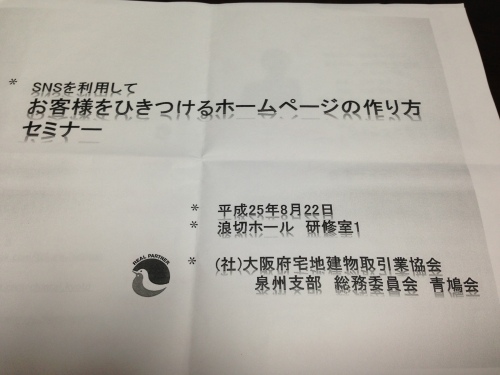 昨日は岸和田波切ホールで、(社)大阪府宅地建物取引業協会 泉州支部のIT研修でした・・・内容は「SNSを利用して お客様をひきつけるホームページ(HP)の作り方」でした・・・講師の方は、ナント!弊社トランクルームのHPを7年前に創って頂いたウエブデザイナーの方だったのです(最初のHP)・・・世間は狭いですねェ・・・フェイスブックでは繋がっていましたが、実際に会うのは7年ぶりです・・・会場に着くと、早速挨拶をしに行きました・・・7年前はHP制作会社の社員でしたが、今は独立されて自分でITビジネスをされているようです・・・まだ30代という事で、勢いを感じ好感のもてる青年IT実業家といったイメージで、今後益々期待できます・・・若いというのは、イイですねェ・・・という事で、1時間という短い時間でしたが、中身の濃いセミナーで、非常に有益でした・・・受講者の中で、HPやブログ、ツイッター、ミクシイ、フェイスブックと私が一番イロイロやっているようでしたが、まだそれぞれが「有機的に」結びついていないというのが現状の悩みです・・・今回のセミナーは、その悩みを打開する「ヒント」を与えてくれたという意味で、ヨカッタと思います・・・不動産というビジネスは多業種に比べ、まだまだアナログ的な部分が多く、デジタル(IT)的な事が少ないですが、着実に「デジタル(IT)化」の波が押し寄せてきているような気がします・・・その「波」に乗ろうと、日々アレヤコレヤと試行錯誤しているのですが・・・これがナカナカ難しい・・・如何に、ITを「自分なり」にモノにするか?が当面の課題です・・・という事で、日々イロイロとITで悩んでいるオッサンにとって、非常に有益な1日でした・・・ここもポチッと押してください!ご協力お願いします!にほんブログ村 にほんブログ村にほんブログ村 大阪府 ブログランキングへ
