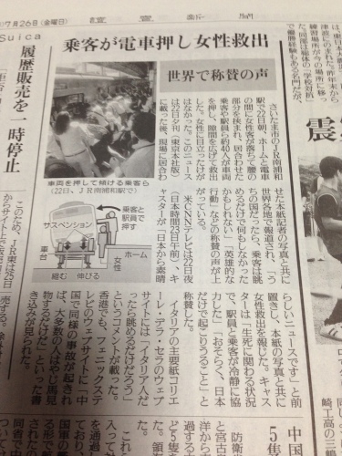 先日の新聞に、ホームと電車の間に落ちた女性客を助けるために、その場に居合わせた見知らぬ者同士が力を合わせて電車を傾かせ、女性を救助したという感動的な記事が載っていました・・・この記事が、世界各国で称賛されたらしいです・・・日本人なら、ごく当たり前ですが・・・海外では、知らんぷりみたいです・・・確かに、日本では大勢集まって(ボランティアで)祭りや盆踊り、学校の運動会や文化祭をよく開催しますが、海外ではカーニバルなど多少ありますが、人が集まるのは「デモ」しか印象がありません・・・日本人にはまだまだ他人との協調性があり、海外は個人主義が強いという事でしょうか・・・これが世界に誇れる「日本人の素晴らしさ(良さ)」ですねェ・・・大いに、自慢したいと思います・・・日本人は元々農耕民族で、一定の場所でずっと暮らしていましたから協調性が大事でして、他方ヨーロッパ民族などは元々狩猟民族で、獲物を追い求めて住居は季節に応じて移動していましたので、我が強くなるのは当然です・・・貝塚市のような日本の地方都市にもマンションとかが増え、かなり希薄になったとは言え、まだまだ町内会や青年団、婦人会とかの「ムラ社会」があり、それがまだ一役買っているのか・・・しかし、もっと田舎へ行けば人口が激減している「限界集落」が増えているようで、日本の人口の約半分が3大都市圏に集中しているのが、気になるところです・・・殺伐とした都会で子供が育てば、本来の「日本人のよさ」が無くなってしまう・・・と危惧するのは私だけではないでしょう・・・長期的に見て、近代的な農業の振興や先端事業の拠点を田舎に創り雇用を生み出す事によって、人口が全国各地に散らばるような施策を考えるべきでしょうねェ・・・ここもポチッと押してください!ご協力お願いします!にほんブログ村 にほんブログ村にほんブログ村 大阪府 ブログランキングへ
