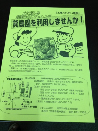農業委員会に行った時に、「貸農園を利用しませんか!」というパンフレットも見つけました・・・全国的に貸農園が流行っています・・・それも、大都会の東京や大阪市内から「片道1時間以内」の・・・この「片道1時間以内」というのがミソで、普段は都会に住んで仕事をして、週末の土日だけストレス発散とリフレッシュを兼ねて「土に親しみ、野菜つくりの趣味を楽しむ」のです・・・これが毎週片道2時間となると、チョッと負担になり逆にストレスが溜まります・・・かつてマスコミが盛んに、定年後「田舎に移住して農業」でもとか、宣伝していましたしかし、現実問題として田舎は病院も少ないし(年取ると病気が心配)、買い物にも不便という事で不発に終わったようです・・・それより、普段は医療とショッピングが充実した都会に住み、週末は片道1時間以内の田舎で遊ぶ・・・というパターンが浸透しつつあるようです・・・大阪市内や堺市から片道1時間以内で「田舎を味わう」には貝塚市の山手地区がピッタリです・・・私の自宅から車で1分も走ればで田んぼだらけ、10分で山だらけです・・・私はこのように普段田舎に住んで仕事をしていますので、逆にミナミやキタといった都会に行く事がリフレッシュか・・・ここもポチッと押してください!ご協力お願いします!にほんブログ村 にほんブログ村にほんブログ村 大阪府 ブログランキングへ