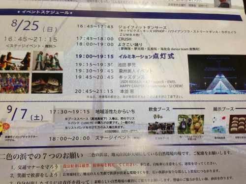 最近あちこちで、「サマーフェスタ貝塚」のチラシを見ます・・・8月25日から9月7日まで、貝塚市の二色の浜海水浴場でイルミネーションが見れるようです・・・二色の浜と言えば、大阪府の海水浴場で大昔から有名で、大阪の人間で知らない人はモグリです・・・私ももちろん、赤ちゃんの頃からよく行きましたし、一時期娘らが小さい頃はゴムボートや浮き輪やスノーケリングセットを持って、ウインドサーフィンも兼ねてよく通いました・・・今は、もっぱらウインドと言えばマーブルビーチですが・・・車で10分の二色の浜ではなく、何で20分のマーブルビーチか・・・?それは、二色は近いけれど、ウインドの道具を運ぶのに遠いからなのです・・・まァ、年を取ったので運ぶのが50mほど短くて、アップダウンのないマーブルを選んだ訳です・・・それに二色は砂浜で道具が汚れますので、洗うのに時間がかかるというデメリットがあり、マーブルだと石ころなので、片づけやすいというメリットが・・・まだあった・・・マーブルは駐車料金が無料(タダ)・・・マーブルでシッカリ遊んで、金が要らない・・・せいぜい自動販売機でコーヒーを買うくらいです・・・世の中に、こんな遊びもあったのです・・・帰り際に、ビーチに向かって「有難うございました!」と一礼しないといけません・・・(笑)と、すっかりマーブルビーチの宣伝になってしまいましたが、貝塚市民として二色の浜も褒めなければなりません・・・マーブルと違って、自然の松林が残っていて「海!」という感じです・・・若い頃は、夕陽を見ながら、ウインドで疲れた身体を癒し、デートするにはサイコーにロマンティックでした・・・これに今回のイルミネーション・・・サイコーだと思います・・・25日のイベントには是非行かねば・・・ジョイフィットのキッズダンサーらや、イケちゃんの娘である貝塚出身のシンガー池田夢見さんも出るようですし・・・ここもポチッと押してください!ご協力お願いします!にほんブログ村 にほんブログ村にほんブログ村 大阪府 ブログランキングへ