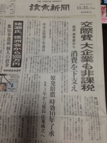 昨日の読売朝刊1面に、「交際費 大企業も非課税」という記事が載っていました・・・中小企業では現在特例として年間800万円まで課税対象から引く事が出来ますが、資本金1億円超の大企業にも、取引先の接待などに使う交際費の一部を税務上の経費(損金)として認め、非課税とする方針を固めたようです・・・これで大阪で言うと、北新地やミナミの歓楽街も息を吹き返すかもしれません・・・また百貨店やスーパーなどの小売業にも好影響が期待できます・・・来年度からの実施を目指すそうで、4月以降の消費税増税後の大不況?を和らげる意図も見え隠れします・・・日本の99%を占める中小企業は別にして、一部の大企業の業績は円安やアベノミクスを背景に業績が好調です・・・その大企業が積極的に交際費を使えば、少なからず日本中にお金が回って好循環が期待できます・・・その影響が中小企業にでも徐々に出れば、万々歳というシナリオが・・・弊社にも良い影響が出ればイイのですが・・・しかしまァ、そういった他人任せの期待というのは良くありませんので、あくまで自助努力で売り上げを上げていくしかないですが・・・いずれにしても、戦略的に来年4月以降「賃料据え置き」を表明していますので、少なくとも増税3%分だけは、企業努力によって余計に売り上げを上げなければなりません・・・ここもポチッと押してください!ご協力お願いします!にほんブログ村 にほんブログ村にほんブログ村 大阪府 ブログランキングへ