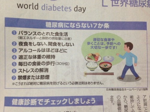 昨日の新聞に「糖尿病にならない7ヵ条」という記事が載っていました・・・以下転写1.バランスのとれた食生活(総エネルギーと脂肪の摂取量に注意)2.夜食をしない、間食をしない3.アルコールはほどほどに4.適正な体重の維持5.毎日の食後の歩行(30分位)6.ストレスの解消7.禁煙または節煙以上私の場合は、80点くらいでしょうか・・・間食と体重が問題ですねェ・・・間食はしませんが、食後の珈琲とデザートは欠かせません・・・これを止めたら、人生の楽しみが一つが減ります・・・やれる事は、量を少し減らすくらいでしょうか・・・体重コントロールは、筋トレで筋肉量を落とさず(基礎代謝維持)、あと6キロ減が目標です・・・この年になると、周りで糖尿病の人が増えてイロンナ話を聞くと、その悲惨な日常生活が身に染みて感じます・・・そういう意味で、絶対に糖尿病にはなりたくないと日頃危機感を感じるのです・・・まァ、糖尿病に限らず重い病気に罹れば、人間で一番大事な「気力」が湧かず萎えてしまって、生活が根底から覆されます・・・不可抗力的な病気も多いですが、自分の努力で予防出来る病気もあるはずです・・・糖尿病は遺伝的なモノも多いと聞きますし、幸い家系的には糖尿病に罹った者はごく僅かしかいませんが、用心に越した事はありません・・・私はチョコレートには目がないという大の甘党ですが、昨年トルコ旅行した時に、超甘党のトルコ人の平均寿命が、糖尿病の多発により日本人より10歳若いというのを聞いたときはショックでした・・・とにかく、饅頭にハチミツをつけて食べるような感じで、甘さを通り越して舌の感覚が麻痺するほどでした・・・外国旅行でフンドシを締め直すようになったのは、何とも皮肉です・・・人間というのは、外的ショックを受けないと、ナカナカ分らない石頭みたいなもんですねェ・・・という事で、1年でも健康寿命を伸ばせば、それだけ「稼いで遊べる」という考えから(仕事や趣味がデキる)、これからも「健康第一」を念頭に入れて生活していきたいと思います・・・ここもポチッと押してください!ご協力お願いします!にほんブログ村 にほんブログ村にほんブログ村 大阪府 ブログランキングへ