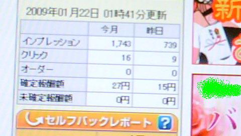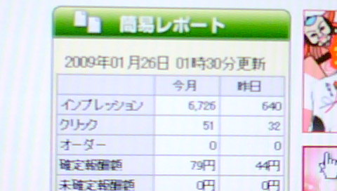 自分で試しに新しく作ったサイトに新しいバナーを載せてサイト登録して自分で10個位クリックして半日位たってから10個同じくクリックしたら おかしいな~ 自分で載せたのをクリックしても意味がないはずなのに?????ん~~~~~ まいっか損した訳じゃないしお^w^)y なんとか1ヶ月でネット代と携帯電話代=1万円は稼げたらいいんだけどお 26日のクリック数が凄いのは26日は本免に行くってオンラインゲームの人に言ってたからじゃないかと思うおたった1人にしか教えてないのに これまた謎だお それに26日はオレンジトラフィックポイント使うの忘れてんだお クリックできるフラッシュ画像でつ 食品専用ブログにこんなの載せてみましたおwここのブログは総合ブログなので1回だけ載せておくおwwwww