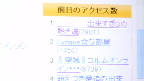 多分ギリギリ新記録を越えたと思うんだけど昔の画像を探すのは大変なんでお( PC内の画像は削除してるからブログ内のフォト内だからだお! ) ・【趣味・ゲーム】・ ★ブログのジャンル別の「趣味・ゲーム」で1位になりましたお21日は午後9時くらいに寝てしまっても~っと宣伝したかったおw ★楽天ブログ内の総合ランキングは25位だったお★ ・【全てのジャンル】・ なぜだか次の日のほうがハッキリ解る新記録を叩き出してたおw(オレンジポイントは21日と同じなんだけど、他の所での宣伝はしてないはずなのに、ん~?) 昨日は別のアフィリエイトを載せたサイトの宣伝に力を入れてたんだおw ちなみに昨日はこんなふうに作ってみましたおw 楽天ブログ内に載せられないアフィリエイト商品はここに載せてるおw ★1個のブログに1~2個のサイトを載せて、ブログの宣伝はブログに宣伝して、したらばの宣伝は2chで宣伝したほうがいいお^0^)y2chでブログのURLを載せて宣伝するとアドレスが載せられない規制くらっちゃうからだおw酷い時は書き込み規制くらって1週間くらい書き込めないんだお;_;)/カナピー