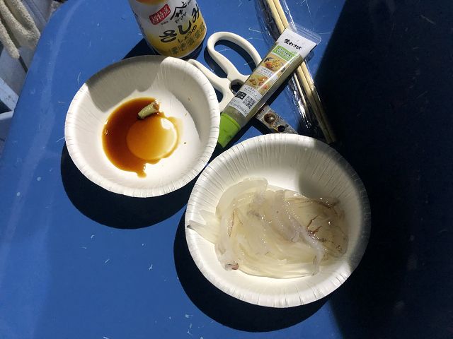 スピニングで腕がパンパンなのと、ハンドルが小さくて指の皮が剥けていたので旦那は早々にイカに離脱。嫁はまだアジ狙いを続けるようだ。