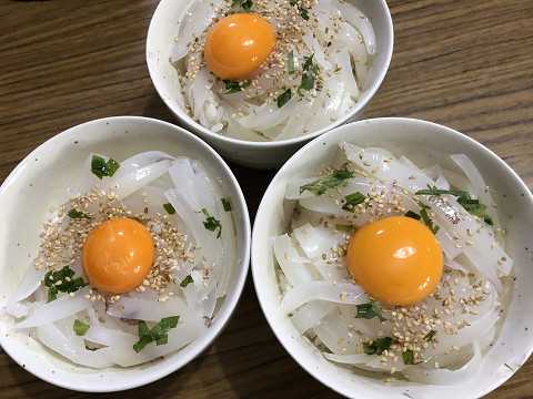 まず、最高の状態で持ち帰ったイカをアツアツのご飯の上に乗せて、黄身を落とし、ゴマ、青じそを添えて誕生。イカ黄金。