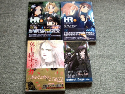 古本届いた その01。HR1巻2巻、女王様ナナカ、School Days言葉編。HR1巻2巻HR(1)ほ~むる~むManga time KR comics 著者:長月みそか出版社:芳文社サイズ:コミックページ数:114p発行年月:2006年10月この著者の新着メールを登録するこの商品の関連ジャンルです。 ・本> コミック> その他楽天ブックス¥860HR(2)ほ~むる~むManga time KR comics 著者:長月みそか出版社:芳文社サイズ:コミックページ数:116p発行年月:2008年04月この著者の新着メールを登録するこの商品の関連ジャンルです。 ・本> コミック> その他楽天ブックス¥860女王様ナナカ女王様ナナカRyu comics special 著者:西炯子/大槻ケンヂ出版社:徳間書店サイズ:コミックページ数:195p発行年月:2007年12月この著者の新着メールを登録するこの商品の関連ジャンルです。 ・本> コミック> その他楽天ブックス¥900School Days言葉編School days(言葉編)Harvest novels 著者:岡田留奈出版社:ハ-ヴェスト出版/星雲社サイズ:新書ページ数:209p発行年月:2005年12月この著者の新着メールを登録する桂言葉と西園寺世界。一人は引っ込み思案で、一人は活発。性格は違うけど、二人はどこにでもいる、ごく普通の女の子。ただ二人は、たまたま同じ相手を好きになっただけ。恋する少女たちには、よくある普通の出来事だ。『普通』のことが重なっただけ。だから、答えもきっと『簡単』なんだろう…。【内容情報】(「BOOK」データベースより)桂言葉と西園寺世界―。一人は引っ込み思案で、一人は活発。性格は違うけど、二人はどこにでもいる、ごく普通の女の子。ただ二人は、たまたま同じ相手を好きになっただけ。恋する少女たちには、よくある普通の出来事だ。『普通』のことが重なっただけ。だから、答えもきっと『簡単』なんだろう…。この商品の関連ジャンルです。 ・本> 小説・エッセイ> その他楽天ブックス¥893