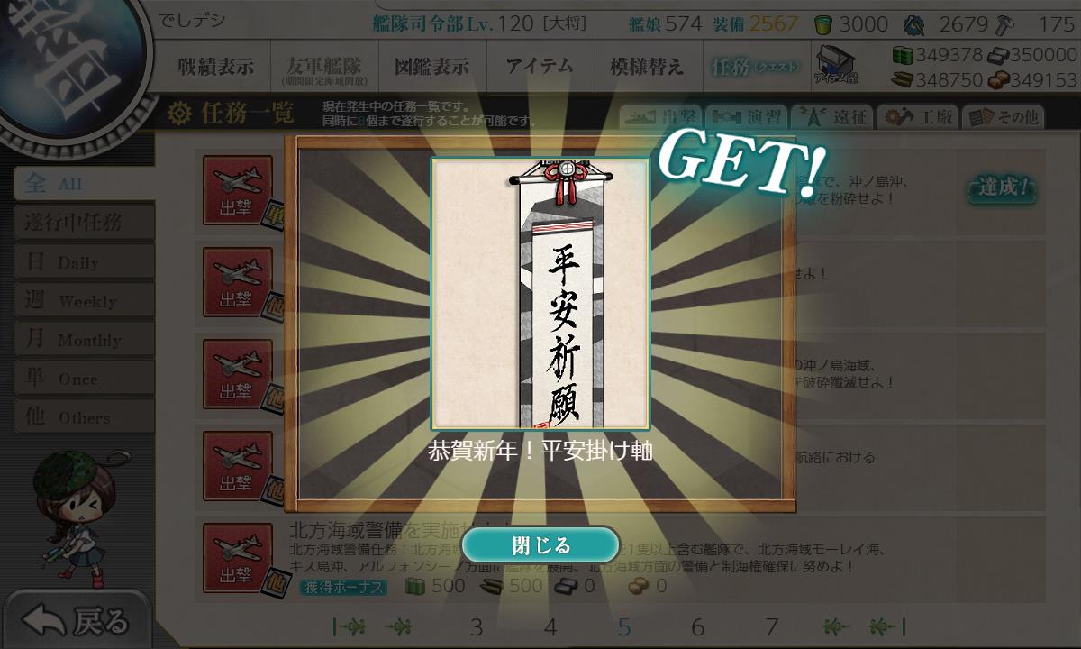 引き続き年末年始及び新春限定任務が続行中です。先週の内に次回のメンテナンスの日時が発表になると思っていましたが、まだ発表されていません。そのせいもあり、未だ限定任務が終わっていません流石に今週中には終わらせたいですね。今回の限定任務で配布された新装備。でも全く使えない。