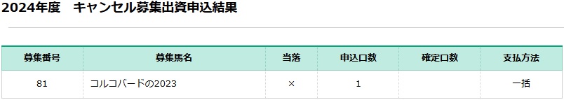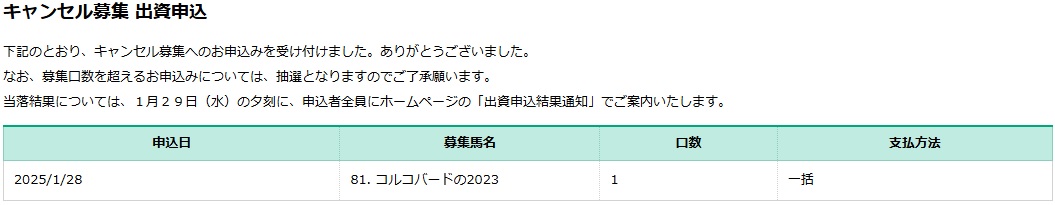 本日締め切られたキャロットのキャンセル募集の申し込みが完了しました。ミリッサの2023とコルコバードの2023で迷ったのですが、結局コルコバードの2023にしました。以前出来れば芝の牝馬が欲しいと書いた通りミリッサの2023の方が欲しかったのは確かなんですよね。散々申し込んで一度も当選したことがないサートゥルナーリア産駒でしかも杉山晴紀厩舎ですから。ただ馬格がないんですよね。最新の更新で436kg。小さすぎると言うほどではないのですが自分の出資馬で小さい馬はあまり走らず、特にキャロットではその傾向が強いので。ネオフレグランスの2023は全敗を避ける為と言うのがありましたし、あの募集価格であの血統ならもしかしたらと言うのがあっての事でしたから。一応4頭出資確定していますし、キャンセル募集は外れる前提なので当たったらラッキーと思ってもう1頭の最優先の時に悩んだコルコバードの2023にした次第です。明日には結果が分かるので期待せずに待ちたいと思います。