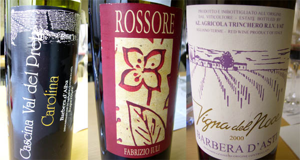 今日は、Barberaのお勉強会でした。Insegnante は、いつものように「Tassoおじさん」こと坂田氏7種類を、それなりの量、飲みますので、帰るころには酩酊。遅摘み vendemia tardivaBarbera d'Alba sp "Carolina" 2003 / Casciana val del Prete 14.5% Hirberg Paschero と同じ畑、エノロゴ Gianfranco Cordero 氏 →果実実重視感想:苺と黒糖。2003のためか、酸がゆるく頼りない喉越し。南国の花→紅茶→ミルクティーRossole V.D.T Monferrato 2001 / Fabrizio Juri13.5%樹齢60年超。1年使用の古Barrique 12M。感想:酸が強い。これはMonferratoの土が白っぽい粘土質のためだそう。小梅→ココナッツミルク→ミルクキャラメル→最後は軽めのすっぱいワインBarbera d'Asti "Vigna del Noce" / Trinchero樹齢70年以上。3000lのBotteで熟成。有機農法。感想:やわらかくて、なんのひっかかりもなく、するする飲めてしまう。Barbera d'Asti "La Romildavi" / Arbiola14%熟成香あり。濃厚だが柔らかい。Barbera d'Alba "Bricco San Biagio" / Ciabot Berton 3000本/年 家族経営酸がおいしい。O.P.Barbera "Ronco Longo" 2000 / BISI粘土質の土壌のため柔らかいタンニン。仏アリエのBarrique 15M(マロラクティック含む)こちらのワインは、Lombardia の Oltrepo Pavese です。感想:果実味が豊かだが、透明感がある。時間がたつと、キャラメルプリン。 "Bricco del Bigotta" 1988 / Braida本日の目玉!説明はいらないでしょう。干し葡萄、旨み系のあじわい、ブルーチーズとあわせると甘味が増す。仙台牛のにぎりが食べたくなった・・・