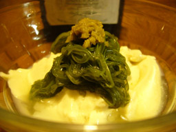 最近海草を食べるのがブームのノラ家。(毎朝おトイレで、前の日のわかめちゃんに再会してます。) 今日のお昼は「マグロのぶつ切りと生メカブ丼」おいしかった~。メカブとマグロ とってもあいますのよ。先日 叙々苑の焼肉弁当 をいただく機会がございました。ジスロマックのファイザーさんご馳走様♪そのお弁当の中に入っていた茎わかめのナムルのようなものが、とっても美味しかったので、再現してみました。お刺身用の茎わかめを細かく切ります。△定規みたいなかんじで。1時間ほど塩抜き。水切りした茎わかめをごま油でじゃ~っとおろしニンニクと一緒にいためて、牛すね肉のスープ少々と塩と赤唐辛子のみじん切りを加えて、なじんだら仕上げに薄口醤油をたら~り。のらのら苑の茎わかめのナムルでございます。明日のお昼は冷麺にして一緒に食べましょう。