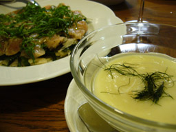 最初は昨日の残りのCAPITEL CROCE 2004@ANSELMI今、酒喜屋でセール中なので、先日リカーワールドで購入したものを味見のためあけたのですが、多分購入は見送りです。香の幅に奥行きがないことや酸が足りないことが原因かな。2004年のワインは酸がきれいなので大好きなのですが、CAPITEL CROCE は がっかりだよ でした。PieropanのRocca 2004にもいえることですが、凝縮感の追求しすぎのような気がします。「水っぽいSOAVEの概念を変えた!」という使命感に燃えすぎて ぼってりしちゃってます。もちろん ワタクシの好みが変わったということもあるかもしれません。次に開けたのは La Chapelle 1999 @あんり・ぶるじょわ青リンゴと白胡椒とウイキョウの香り、レモンピール、白い石。透明感のある苦味とミネラル分がここちいいです。熟成期間の差、葡萄の品種の差があるので、比較にはなりませんね。夕ご飯ジャガイモサラダえんぢ風 アイナメのすり身のパテと長ネギのゼリー寄青大豆のふわふわ・オリーブペーストとかぼす胡椒生もずくほうれん草のRisotto・サマートリフ風味←おいしいRisotto用のお米が今日で終わってしまったので、何か探さなくては!カツヲのタタキサラダ←こういう力強くて赤でもいけるような魚の場合はCAPITEL CROCE があいます。