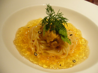 細めのしゃんぱ~にゅぐらすで ぐいっといきましょう♪生からすみとみょうがのぬる~いCapelliniもあるでんてにできました♪