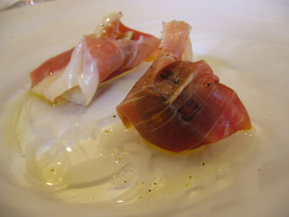 夏場ということで、あっさりと鹿肉のベーコンです。ブタバラのベーコンより脂がきつくないので、ワインとあわせやすい。今回のびっくりのおいしさだったZANNA。これは、下がひろがった火星人のようなグラスで。このグラスがデカンターの役目を果たしたのか、最初からきれいに開いていました。土っぽさとブルーベリーとラズベリーのピューレ。ふかふかと優しい飲み口、サンテミリオンの果実たっぷりのメルローのようです。(CSは苦手ですが、エロチックMerlotは好きです。)定番のタルタルここらへんで、たしか、ぽんそを飲んだのですが、写真がありません。このぽんそは3回目ですが、今回が一番おいしかったですね。あわせたグラスがシラーやブルネロのようなちょっと口が開いた形のぼるど~たいぷでした。赤い実がきれいにでていて、ふんわり甘くて、やさしいお味でした。苦手なシダ系の青臭さはゼロ。みんなさんにも気に入っていただけたようで、よかったよかった。MONTEFALCO SAGRANTINO 2002@CO`LPETRONE Sagrantino100%葉巻の香り、噛みしめるようなタンニン。夏場には濃いです。このワインは冬場に、シチューなどとあわせるべきでした。