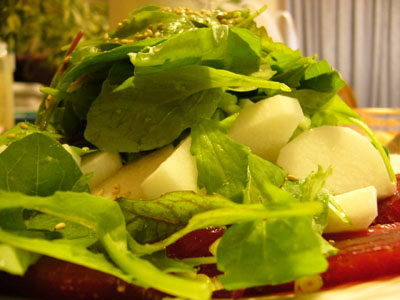 スモークサーモンとモザイクサラダ(ジャガイモ、インゲン、ニンジン):こういう作りおきできるものは、ノラキチのほうが帰宅が早いノラ家では重要。