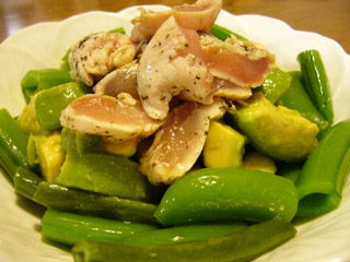 スナックエンドウ、インゲンのゆでたの に どぼ~っとオリーブオイル(本日のは、Umbriaのモノ。)
