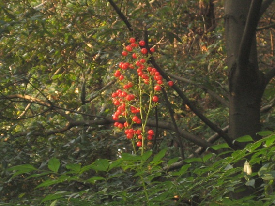 久しぶりの書き込み!!森林公園の下り坂を下ってくるとぽっかりと木漏れ日がその光の中に南天これは縁起が良い!!来年は難を転じよう”難転”やったね!!