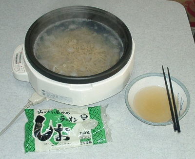 ダイエットドラゴンの本日の、朝食は、なんと、『釜揚げラーメン』です。 電気鍋(深めのホットプレート)に、七分目ほど、お湯を沸かし沸騰したら、生麺のラーメンを入れます。生麺に添付されているスープの素をドンブリにいれ、お湯で薄めて、スープを作ります。生うどんにも、生そばにも、生パスタにも応用できます。 昔々、東京都府中市の甲州街道沿いに、『殿様ラーメン』というお店があって、こんな感じのラーメンが食べれました。あのお店は、いつの間に無くなってしまったんだろう。おいしかったのにナー。 この方法だと、「カタメ」も「ヤワラカメ」も、自由自在です。そういえば、一番硬いのを、「粉落とし」と呼び、次に硬いのを「ハリガネ」と呼んでいたラーメン屋がありました。あの店のラーメンも旨かったな~~。