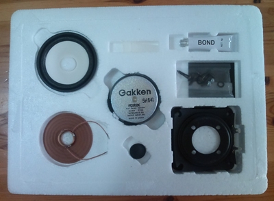 ダイエットドラゴンです。今回は、学研の「大人の科学マガジン[特別編集]」 ”まるごと手作りスピーカーの本” です。 これが、全部の部品です。 磁気回路に接着剤を塗ったところです。 磁気回路と、フレームを合体させたところです。このあと、ナベコネジで固定します。 ボイスコイルを、フレームに接着したところです。黒い筒は、ボイスコイルを、ギャップの正確な位置に固定するための”ギャップゲージ”です。 コーン氏を接着したところです。 ”ギャップゲージ”を取り外したあとキャップを接着しました。 完成写真です。GakkenとFOSTEXのダブルネームです。 部品が入っていた、ダンボールの箱にセットしてみました。そこそこ、いい音が出ていると思います。 トランジスタ技術の付録のD級アンプでも組んで、防水ベニアでエンクロージャーを作ってみようかな?おっといけない、スピーカーをもう一個手に入れなくっちゃだわ!!!