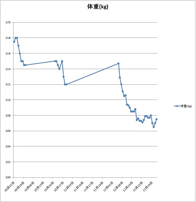 左端は、118キログラムぐらいです。右端は、107キログラムぐらいです。ということは、三か月と数日で11キログラムぐらい痩せてしまったわけです。ダイエットドラゴンは、いかにして11キログラムも体重を落としてしまったのか?続報を待て!!