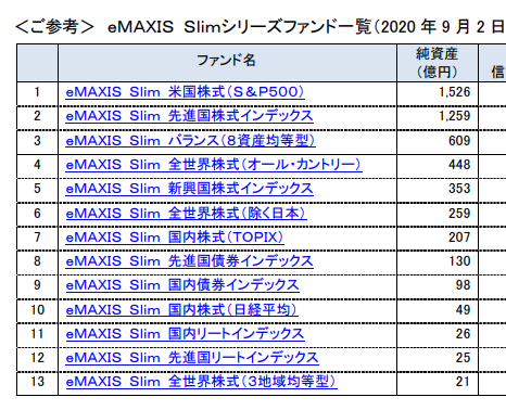 eMAXIS Slimシリーズの各投資信託の純資産総額です。