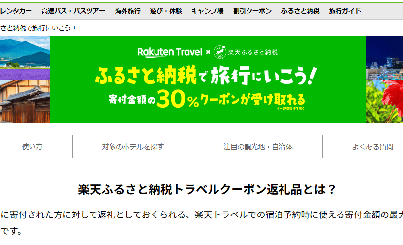 こんにちはコロナも5類に変わり、「夫婦で旅行に行こう!」ってことになり楽天トラベルでワクワクしながらどこに行こうかと調べていたらなんと、ふるさと納税が旅行にも使えるということなのでふるさと納税を使い楽天トラベルで旅行予約してみました。ふるさと納税ってお得な制度なので、毎年利用してまして、今年もいつも買っている、みかんなどにしようと思ってましたが、楽天トラベルで使えるということなので、今年は旅行に使うことにしました・楽天トラベルでふるさと納税してみました画像出典元楽天トラベル 楽天トラベルでふるさと納税が使えるってどういう事?って思った方もいると思いますが簡単に説明すると画像出典元楽天トラベル1 楽天ふるさと納税で旅先自治体の楽天トラベルクーポンを買う(寄付する)※寄付額の30%がクーポンで受け取れます。2 楽天トラベルで予約時に割引クーポンを利用する。※予約後に楽天ふるさと納税から楽天トラベルクーポンを買っても利用できます。ふるさと納税対象ホテル・宿の探し方画像出典元楽天トラベル楽天トラベルトップページのふるさと納税をクリックすれば画像出典元楽天トラベル地域・条件から簡単に探せます画像出典元楽天トラベルふるさと納税対象ホテル・宿だった場合、上記画像のように「ふるさと納税対象」と表示されています。「楽天トラベルふるさと納税 宿泊予約で使える割引クーポンを入手する」をクリックすれば宿泊する自治体の楽天ふるさと納税サイトに飛び、ふるさと納税&クーポン入手できます。楽天ふるさと納税公式HP楽天ふるさと納税で入手したクーポンの使い方画像出典元楽天トラベル楽天トラベルトップページの予約確認をクリックすれば上記画像になり「ふるさと納税クーポンを利用」をクリックします。画像出典元楽天トラベル「ふるさと納税クーポンを選択」で適用をクリックします。画像出典元楽天トラベルクリックすれば「ふるさと納税クーポン適用済み」となりこれでクーポン割引が適用されたことになります。実質負担0円で6000円割引クーポンゲット今回2万円をふるさと納税し、6000円の割引クーポンを頂きました。2万円をふるさと納税しましたがふるさと納税って実質負担は2000円。しかし楽天のキャンペーン、5の付く日や買い物マラソンを利用し楽天ポイントが2000ポイント近く還元されたので、実質0円に近い負担で、6000円の割引クーポンを使えたのでやっぱり、ふるさと納税はお得ですよね。楽天トラベル×ふるさと納税公式HPそもそもふるさと納税って何?私が思うふるさと納税の魅力やお得なポイントについて少しお話ししたいと思いますふるさと納税とは、自分の住んでいない地方自治体に寄付をする制度です寄付をすると、所得税や住民税が控除されますまた、寄付した自治体からお礼の品がもらえますお礼の品は、各地の特産品やグルメなど、さまざまなものがあります楽天市場のふるさと納税では、お礼の品をジャンルや金額、地域などから探すことができます楽天ふるさと納税のおすすめポイント楽天ふるさと納税のおすすめポイントは、- 楽天会員なら楽天市場でお買い物するのと同じやり方で寄付ができる。- 楽天ポイントが貯まる。寄付金額の1%分のポイントがもらえます。・ポイント還元を考えれば、実質0円に近い負担で利用できる。- 楽天トラベルクーポンや施設利用券など、旅行に関するお礼の品もあります。- ワンストップオンライン申請なら確定申告しなくていいので、税金控除の手続きが簡単になる。(購入する時、ワンストップ申請を選ぶだけ)ふるさと納税は、地域活性化を支援しながら、自分に合ったお礼の品を楽しめる制度です。ポイント還元を考えると実質負担0円で、利用できる、商品もあるのでぜひ、楽天ふるさと納税を利用して楽しんでください楽天トラベル×ふるさと納税公式HP楽天ふるさと納税公式HP楽天ROOMに、欲しいものや、好きなものを載せています♪バナーをクリックすると私のROOMに飛びます♪