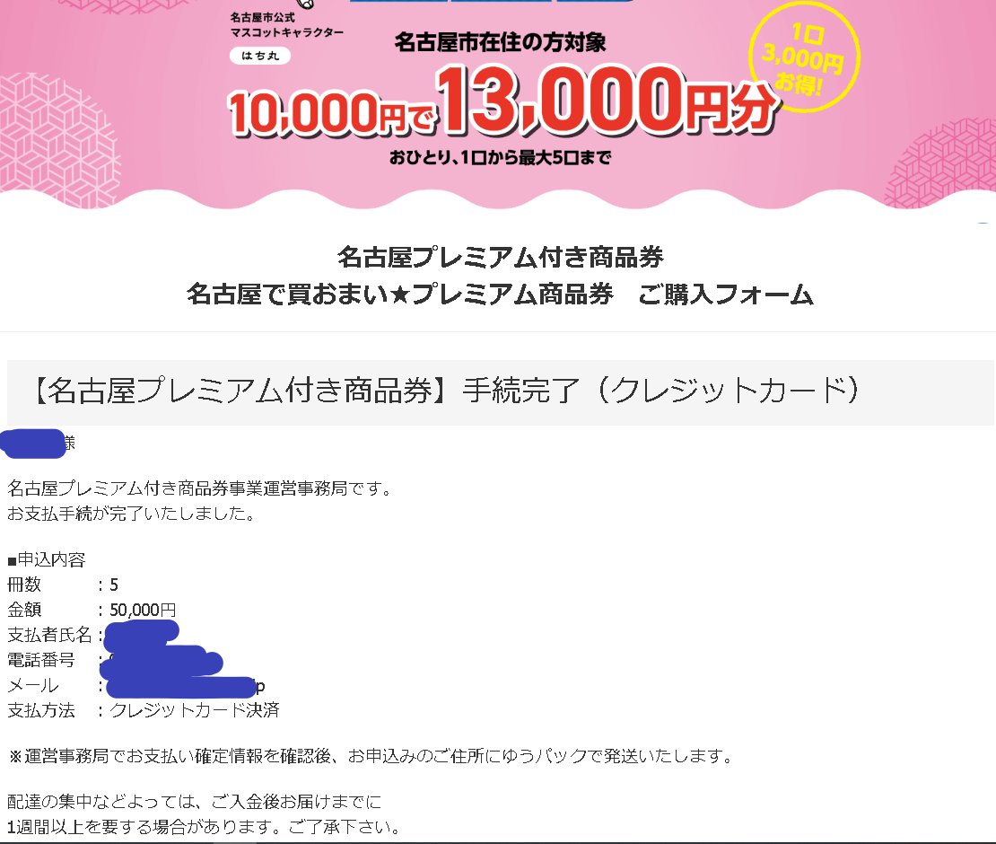 5月に申し込みしていた名古屋プレミアム付き商品券が当選したので早速、購入しました5口分、5万円購入したので、1万5千円分お得にまだ、届いていないですがとりあえず、無料分で焼き肉に行こうかと夫婦で楽しみにしています