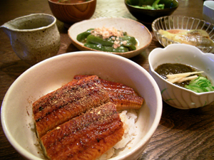 今日のばんごはんは・・・ 鰻丼 モズクと胡瓜の酢の物 ピーマンの焼きびたし 焼きなすのごまだれ 塩茹で枝豆 赤出汁(豆腐・葱)昨日は土用丑の日。昨日、鰻を食べなかったわが家は(しかし一応、“う”のつくものは食べたのだが)、一日遅れで今日が鰻の日。ふっくらと蒸した肉厚の鰻に山椒をたっぷりかけて。今日の夕方、たぶん勘違いして生まれてしまったであろうセミが鳴いていた。雨なのに。妙に大きく響くセミの鳴き声は、なんだかもの悲しい。▼クリックお願いします▼ブログランキング [ランキングオンライン]