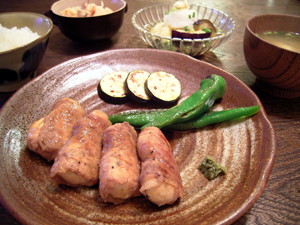 今日のばんごはんは・・・ 豆腐の豚肉巻 柚子胡椒添、ズッキーニと万願寺唐辛子のソテー 賀茂茄子の揚げだし(賀茂茄子、大根おろし、生姜、葱) 切干大根の煮もの(切干大根・人参・干椎茸・さつま揚げ) じゃがいもと玉葱の味噌汁 ごはん以前、お弁当に入れた“豆腐の豚肉巻”、一度晩ご飯に作りたいと思うこと約二ヶ月・・・ようやく晩ご飯に登場させることができた。前回同様、照り焼きダレには柚胡椒を入れ、さらに柚子胡椒を添えて、つけながらいただいた。やはり出来立てとお弁当ではエライ違いのようで、ダンナも大喜び。二日連続で登場の賀茂茄子、今日は揚げだしで。田楽も美味しいけど、揚げ出しもまた違った美味しさが味わえる。その時だけのオイシサを味わえる旬野菜、今のうちに愉しまなくっちゃ!▼クリックお願いします▼ブログランキング [ランキングオンライン] 旬の京野菜はいかが?