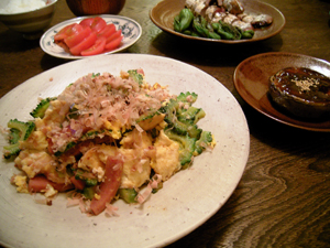 今日のばんごはんは・・・ ゴーヤチャンプルー(ゴーヤ・ポーク・豆腐・たまご・鰹節) かつおの腹皮と鷹峯唐辛子の焼いたの 賀茂茄子の田楽 スライストマト アーサーのおすまし 蒸しトウモロコシ ごはん今日はなんだか“酒のアテ”っぽいゴハン。ゴーヤチャンプルーは豚で作っても美味しいが、ポークを使うと、より沖縄っぽくなって美味しい。鹿児島の名産(?)、鰹の腹皮はいただきもの。ちょっとお酢をつけて食べるのが良い。芋焼酎をロックかお湯割で!といきたいトコロだが、ひとりで飲む気分でもないのでやめておいた。▼クリックお願いします▼ブログランキング [ランキングオンライン]
