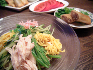 今日のばんごはんは・・・ 冷やし中華(蒸し鶏・錦糸玉子・ハム・三度豆・胡瓜) 牛挽肉と春雨のオイスター風味春巻き、香菜とグリーンリーフ添 冷やしトマトのサラダ、バルサミコドレッシングかけ13日(水)は夕食を済ませた後、あわただしく映画にでかけたため、まとめて更新。牛挽肉と春雨のオイスター風味春巻きは、tama-gonさんの豚ひき肉のオイスター風味春巻きにヒントを得て、アレンジしたもの。アレンジ・・・というとちょっとカッコイイ(?)けど、豚挽き肉が無かったので牛で代用して大名竹の残ってたのを入れて、五香粉をきかせたダケなので、さほど変わりはない...(と、思う)。この春巻き、tama-gonさんも「簡単なのにとてもおいしい」と書いておられるが、まさにそのとおり!!スイートチリソース&香菜との相性もバツグン!わが家でも定番になりそうだ。ほんま、いつもおおきにです~!tama-gonさん!ブログランキング [ランキングオンライン]
