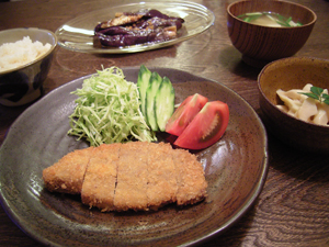 今日のばんごはんは・・・ ビフカツ、キャベツの千切り・胡瓜・トマト添え 蒸し茄子の中華風サラダ 大名竹の酢味噌和え 大名竹の筍ごはん 味噌汁(豆腐・葱)安くて美味しい近江牛が手に入ったので、今日はビフカツ。以前ビフカツをして以来、ダンナはビフカツのトリコらしい。ステーキでもいけるお肉なので、高温でさっと揚げたビフカツはとっても柔らか&ジュースィーなのだ。ソース&グリーンマスタードでも美味しいが、最近ハマってるお肉の食べ方は山椒&お塩。挽きたての山椒が上質な肉の味を際立たせる、最高の食べ方だ。鹿児島の祖母からのお裾分けの『大名竹』。普通の筍よりアクが少ないそうで、アク抜きもいらないそうだ。たしかに、茹でたものをスライスして食べても口の中がえぐえぐしない。酢味噌でいただくと美味しいということで、先の柔らかい部分は酢味噌和えに、下の部分は筍ごはんにした。甘みがあり、とても美味しい。こんな時期にまさか新鮮な筍を食べられるとは思ってもいなかったので、なんだか得した気分だ。▼クリックお願いします▼ブログランキング [ランキングオンライン]