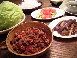 今日のばんごはんは・・・ 挽肉のレタス包み ・挽肉甘味噌炒め(挽肉・エリンギ・パプリカ・筍・白葱など) ・春雨の揚げたの ・レタス 蒸し茄子の中華風サラダ オクラとトマトのサラダ わかめスープ ごはんダンナの好物“挽肉のレタス包み”を作った。自分で作るのは初めて。台湾料理屋で以前食べたものを思い出しながら・・・、最後に五香粉を加えてみたりして、なかなかまとまった味に完成した。レタスに揚げた春雨と挽肉を入れて包み、ほおばる。この瞬間がたまらない。今日は、たまらずひとりでビールを開けてしまった...。▼クリックお願いします▼ブログランキング [ランキングオンライン]