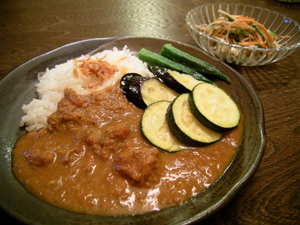 今日のばんごはんは・・・ 南果特製スパイシーカレー、ナス・ズッキーニ・オクラの素揚げのせ サラダごぼう・人参・胡瓜・スプラウトの胡麻ドレサラダ今日は久しぶりに友人が家に遊びに来た。できたてほやほやのスパイシーカレーや美味しい二三味アイスコーヒー持参で!せっかくなので、今晩早速いただいた。南果で出されてるカレーを模して素揚げの野菜をのせてみたが、これが、たまらなく美味しい。姉さん、ありがとう!また出前よろしくぅ!! ※通常、南果では出前はされておりません(笑)。 スパイシーカレーが食べたい方はお店へどうぞ。→南果▼クリックお願いします▼ブログランキング [ランキングオンライン]