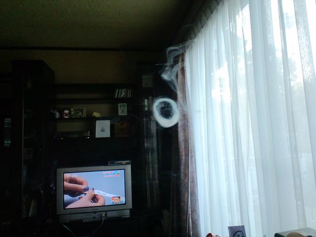 今日の朝は5時半くらいから目が覚めてしまい、2度寝はしたくなかったのでそのまま布団から抜け出して目覚ましテレビだったか朝ズバをぼんやりと見ていた。起きてしまえばまずタバコ。やっぱりいつものように煙のリングを作ってボーっとした顔(目?)で煙が壊れるまで目で追っている自分に気付く。それで、今日も写メにおさめてみました。もうこんなのばっかりは写さないけどね。と、言いつつ壊れかけのリングが2個。